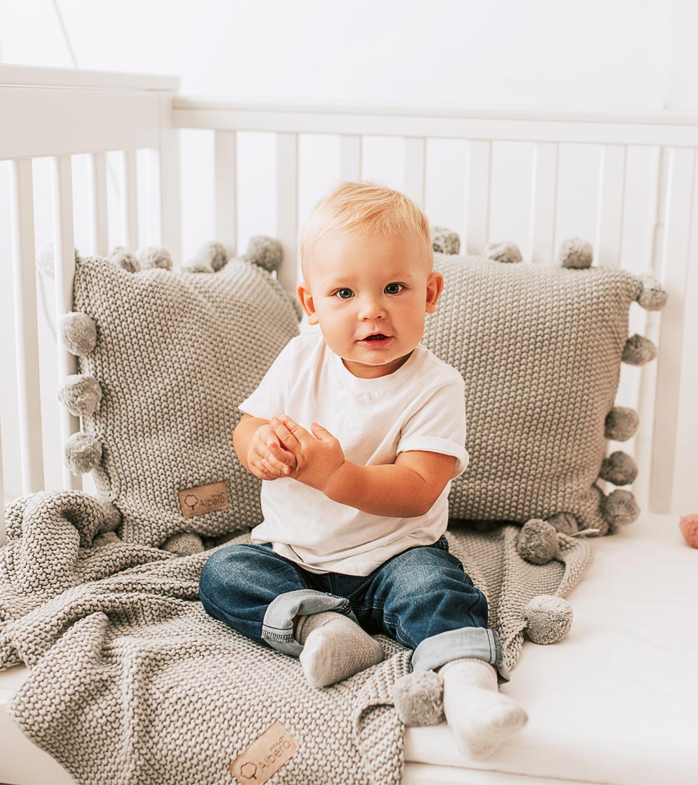 כרית מציגה עיצוב מודרני ומלא חן. הגוף המרכזי סרוג , המעניקה מרקם עשיר ונעים למגע. ההיקף כולו מעוטר בפונפונים רכים באותו גוון