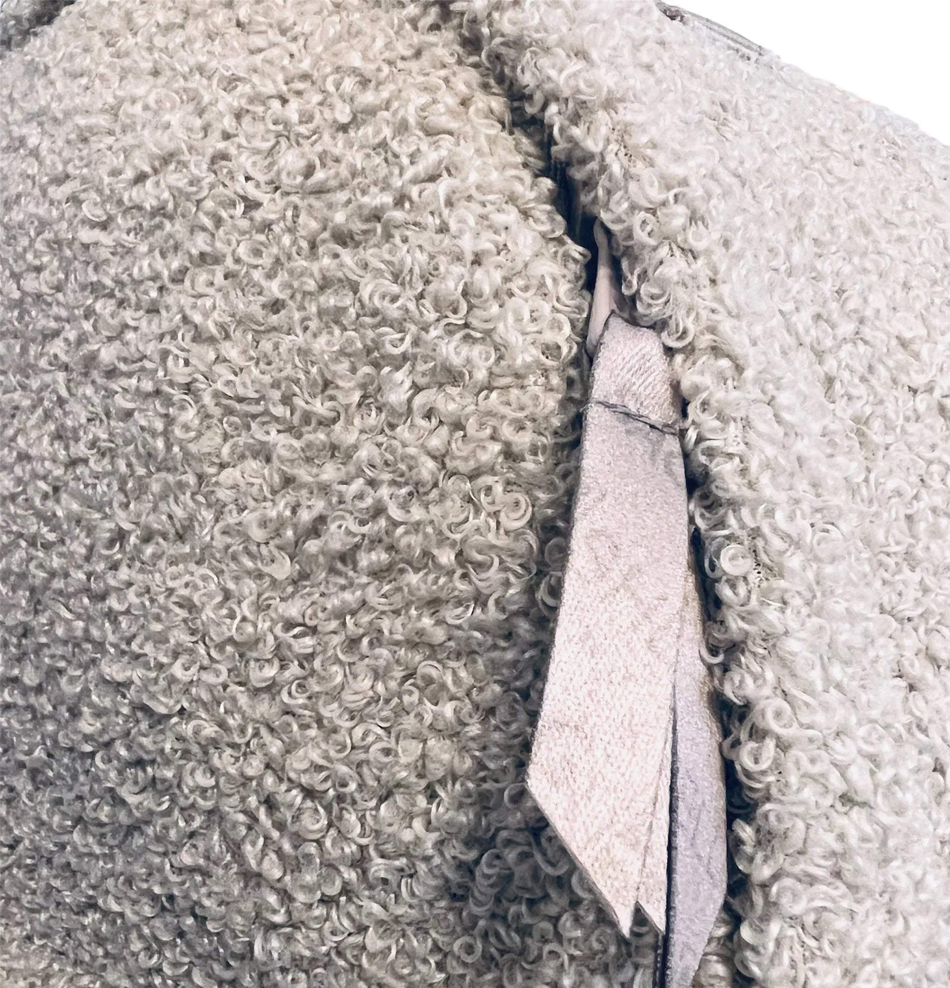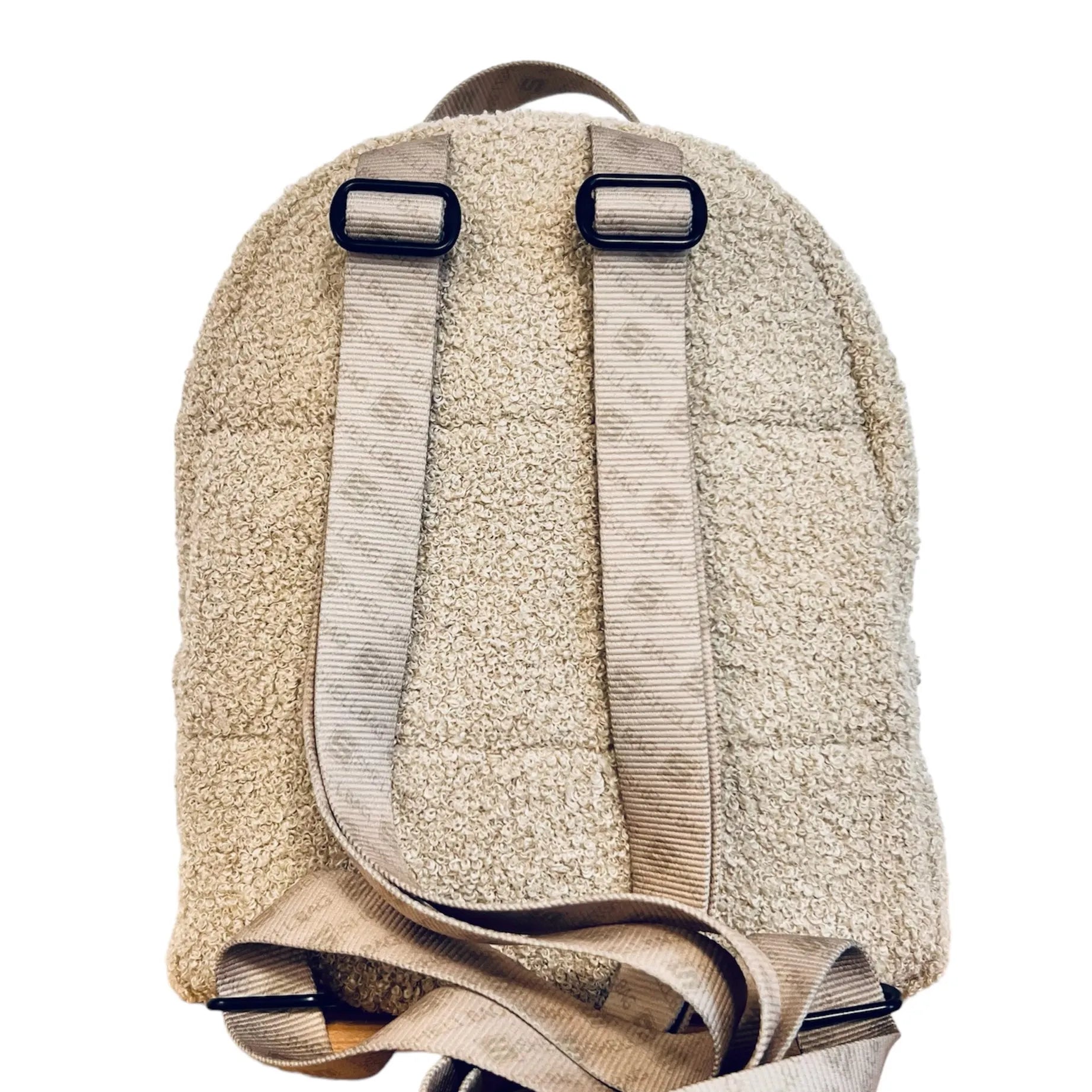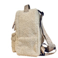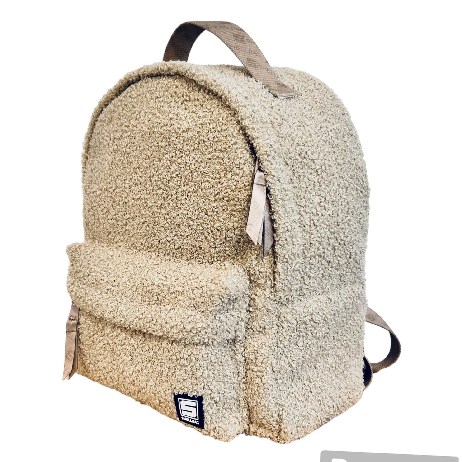 תיק גב קומפקטי ומסוגנן בעל מראה ייחודי. התיק מכוסה באריג בז' בעל טקסטורה מיוחדת, המזכירה פרווה קצרה ורכה, ומעניקה לו מגע נעים וחמים